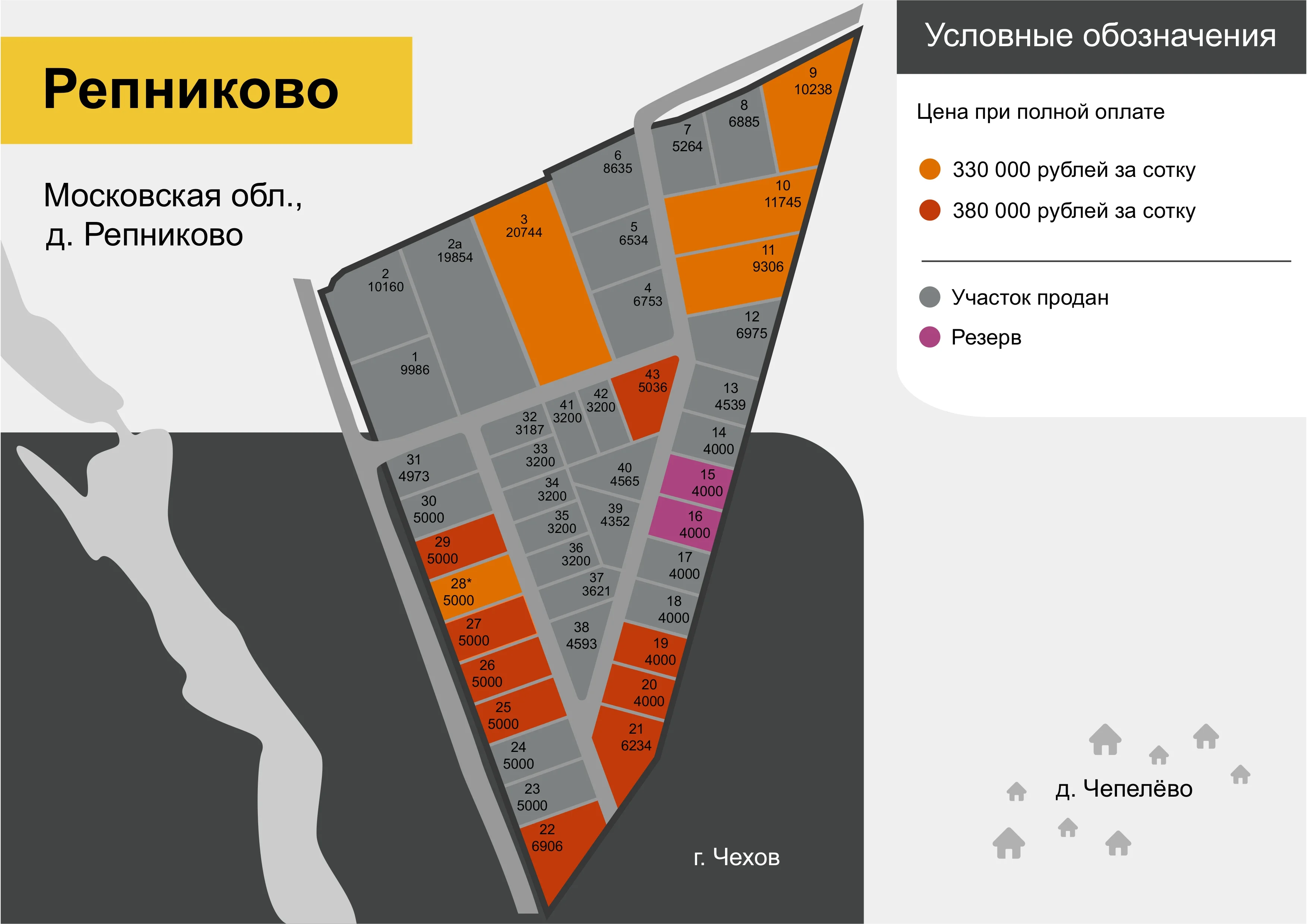 Цена участков промышленного назначений в РЕПНИКОВО от 300 до 350 тыс. рублей за сотку